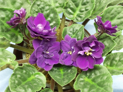 Очень крупные, темно-сливовые, махровые звезды, лепестки атласные, с серебристой изнанкой. Лист темно-зеленый, ложковидный, снизу темно-бордовый. /Архипов Е./