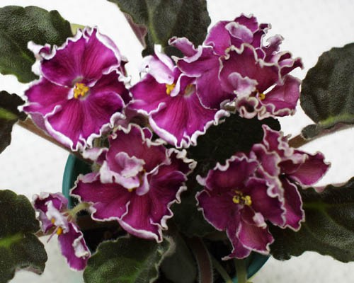 Простые и полумахровые корично-вишневые анютины глазки с гнутыми лепестками. Более темными лучами из центра и прерывистой белой каймой по краю лепестков.
